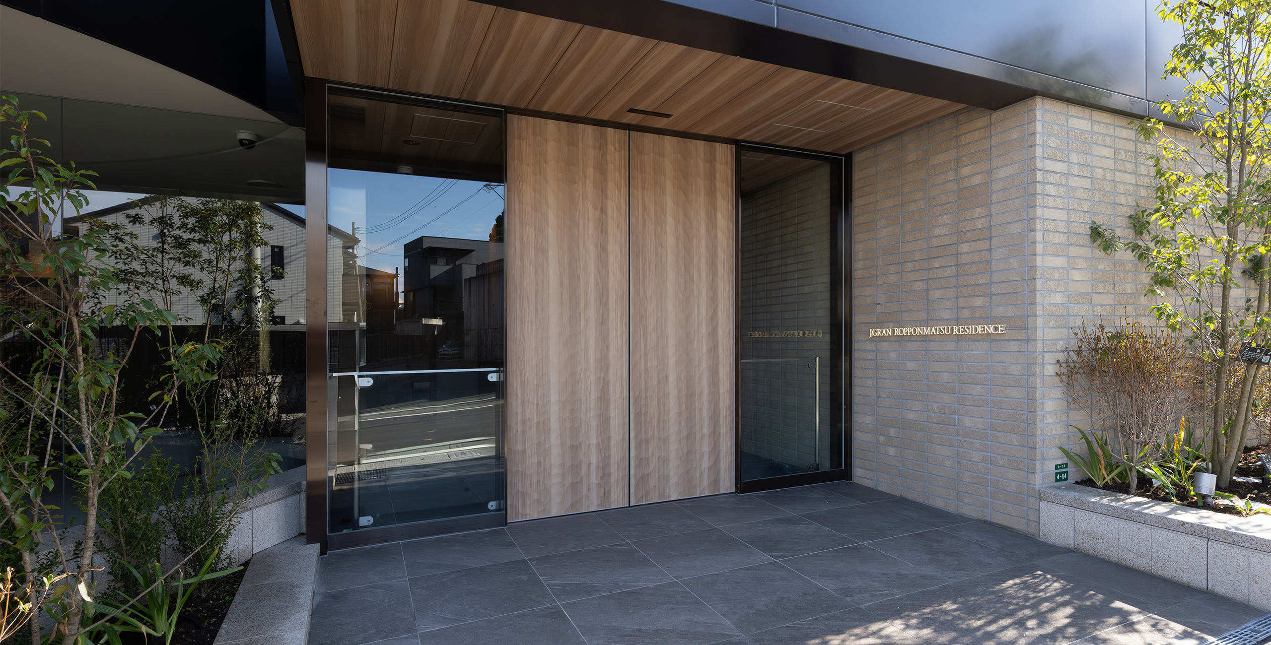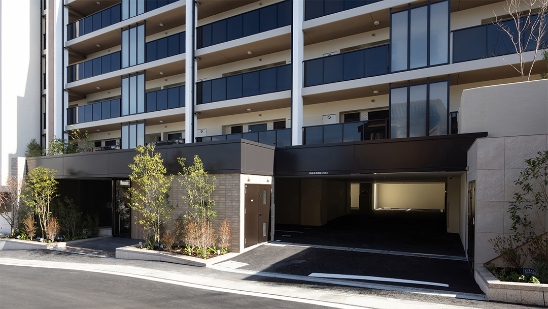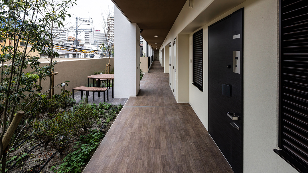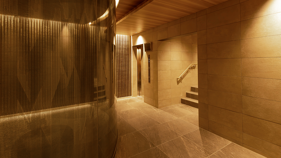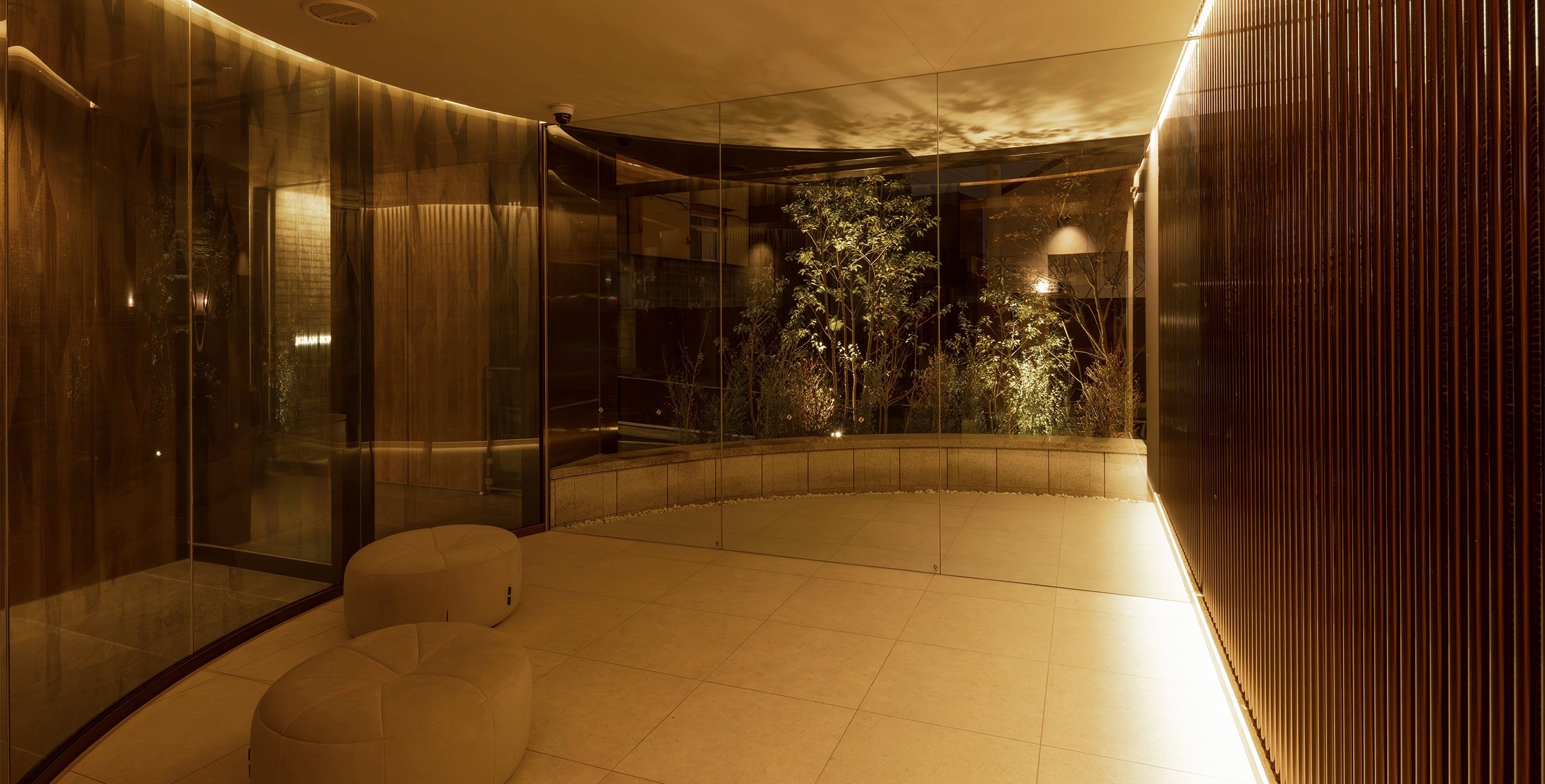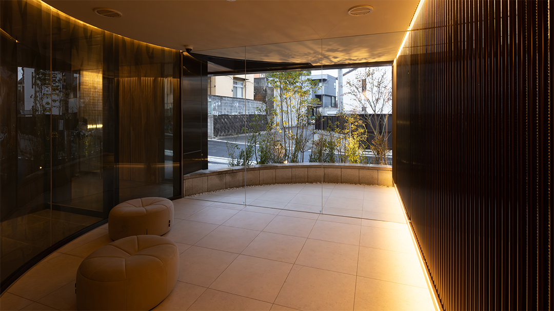 Considering this local context, the project designers created common areas based on the concept of a home that coexists with the garden, using lush greenery, gardens, and natural materials as themes.The design follows the spatial concept of a seamless integration of interior and exterior that has long been cherished in this area by extending the natural, unglazed tiles used on the exterior into the interior of the entrance. The vestibule features natural materials, such as wood doors with a Naguri finish, which creates a distinctive textured surface on wood. Historically, this area was lined with samurai residences and bamboo fences, known as “chinchiku-bei,” shaped the valley’s landscape. Today, a bamboo grove covers the eastern part of the site, preserving the region’s strong association with bamboo. To honor this local history, the lounge beyond the vestibule features fabric-covered glass inspired by the bamboo grove. Furthermore, thin, round pipes arranged on the walls express the image of the bamboo grove using modern materials.
