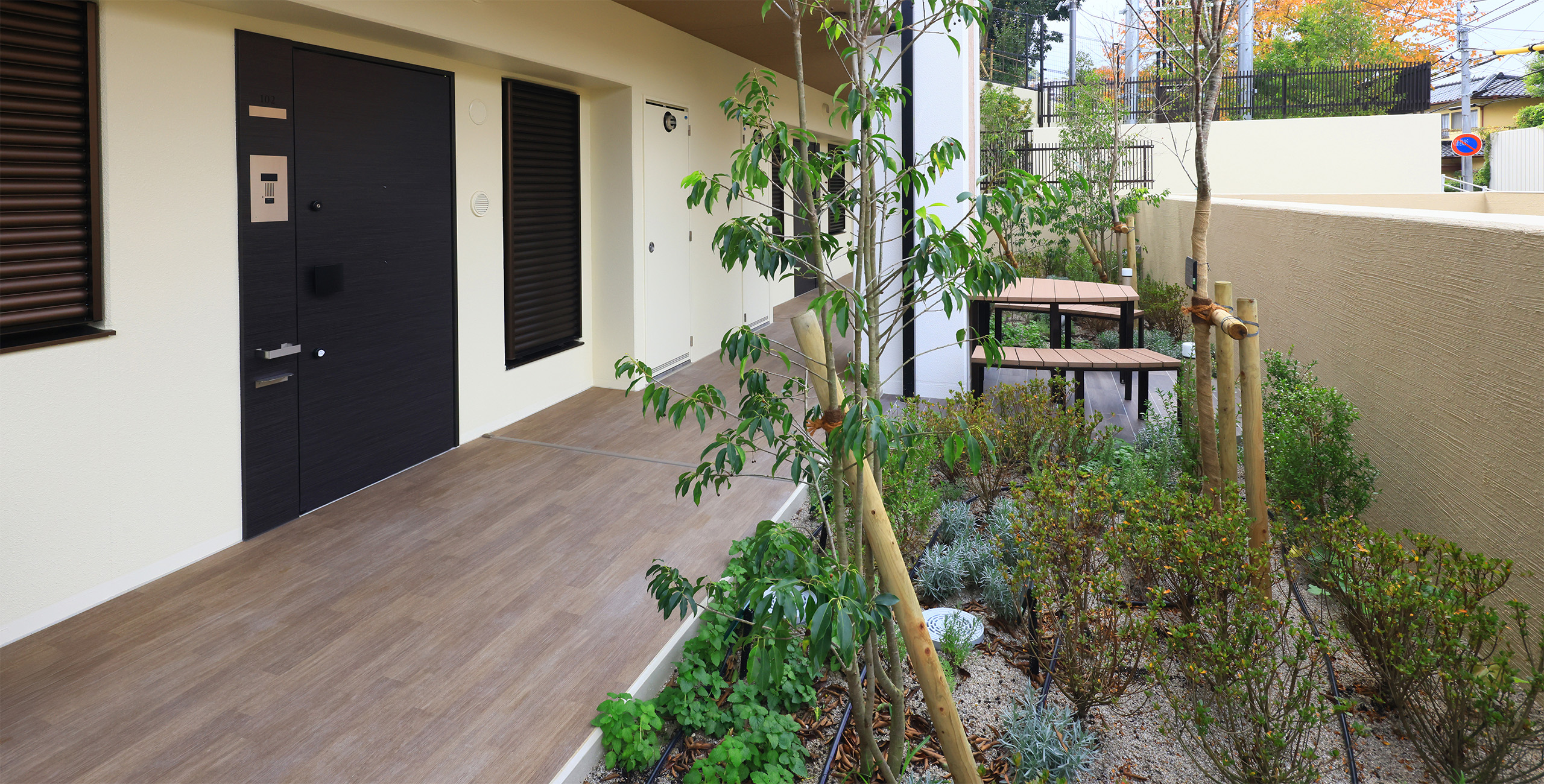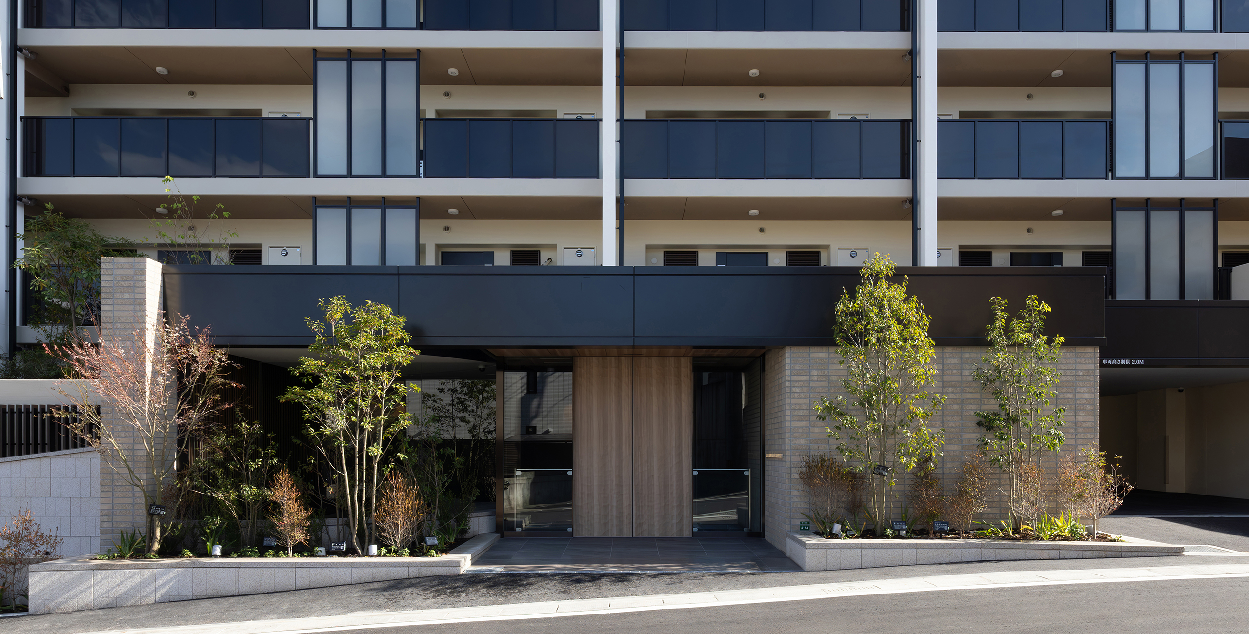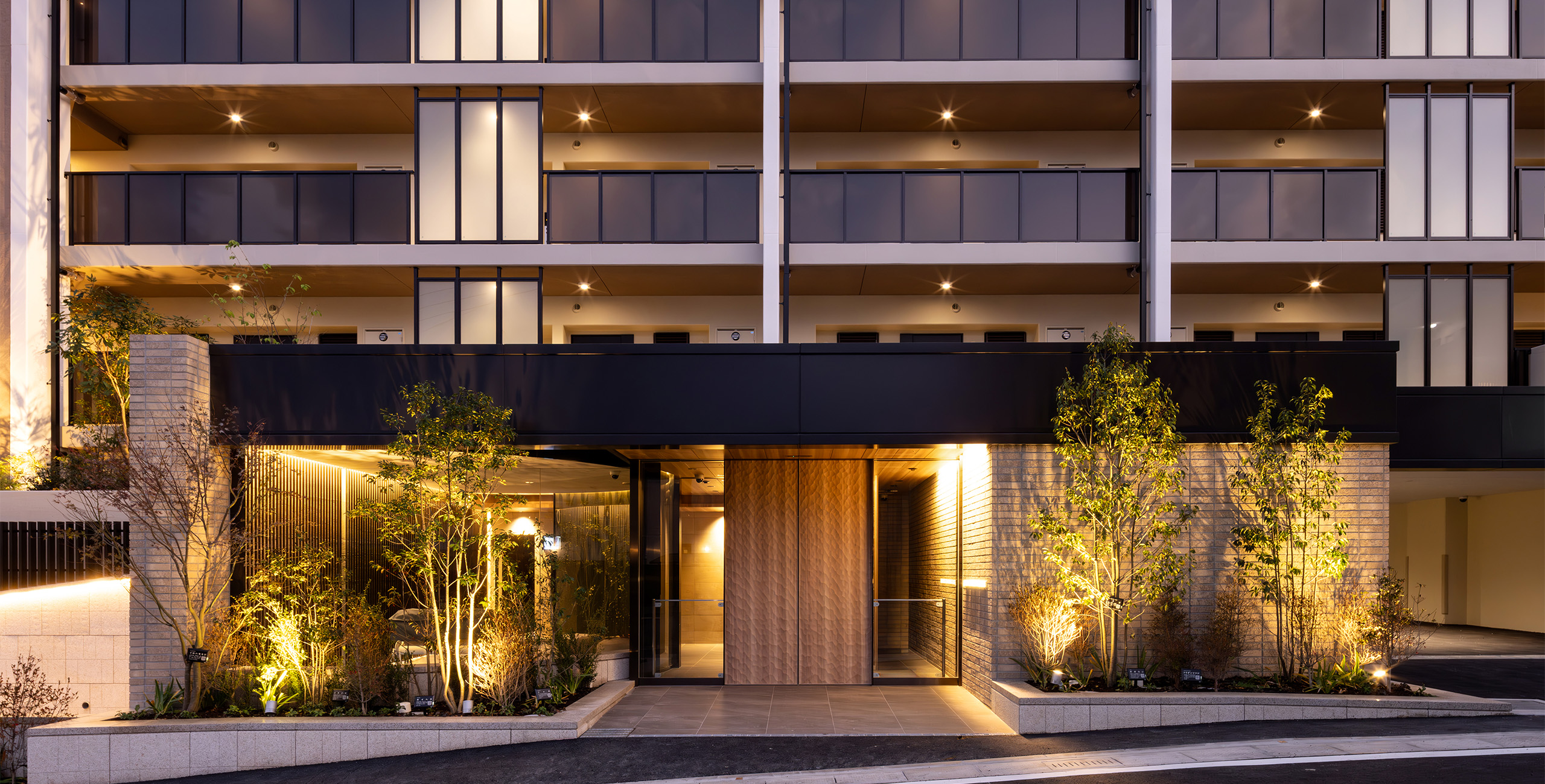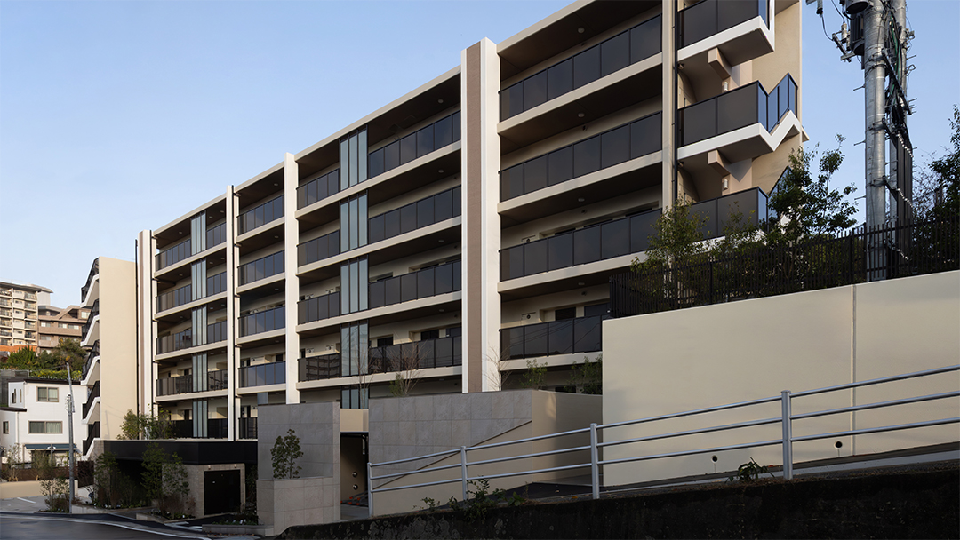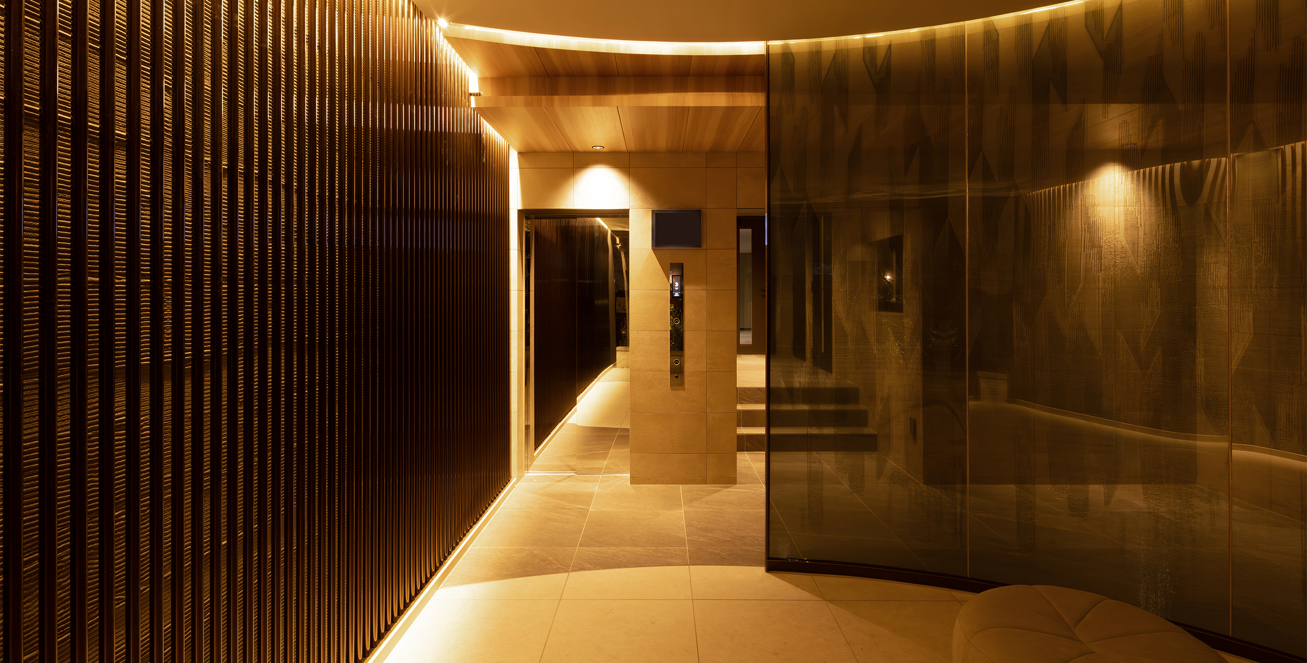 Considering this local context, the project designers created common areas based on the concept of a home that coexists with the garden, using lush greenery, gardens, and natural materials as themes.The design follows the spatial concept of a seamless integration of interior and exterior that has long been cherished in this area by extending the natural, unglazed tiles used on the exterior into the interior of the entrance. The vestibule features natural materials, such as wood doors with a Naguri finish, which creates a distinctive textured surface on wood. Historically, this area was lined with samurai residences and bamboo fences, known as “chinchiku-bei,” shaped the valley’s landscape. Today, a bamboo grove covers the eastern part of the site, preserving the region’s strong association with bamboo. To honor this local history, the lounge beyond the vestibule features fabric-covered glass inspired by the bamboo grove. Furthermore, thin, round pipes arranged on the walls express the image of the bamboo grove using modern materials.