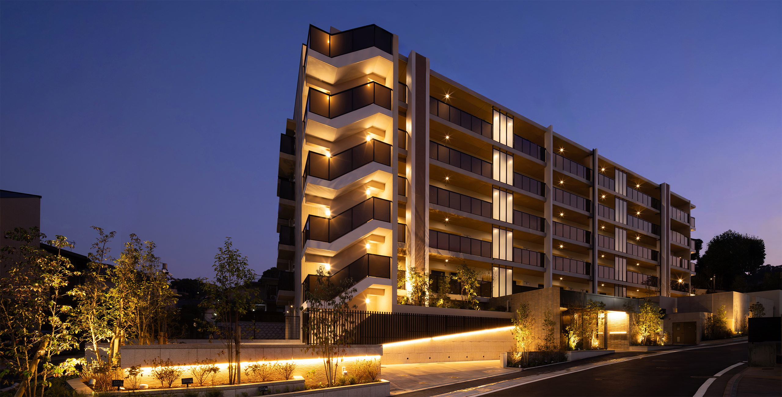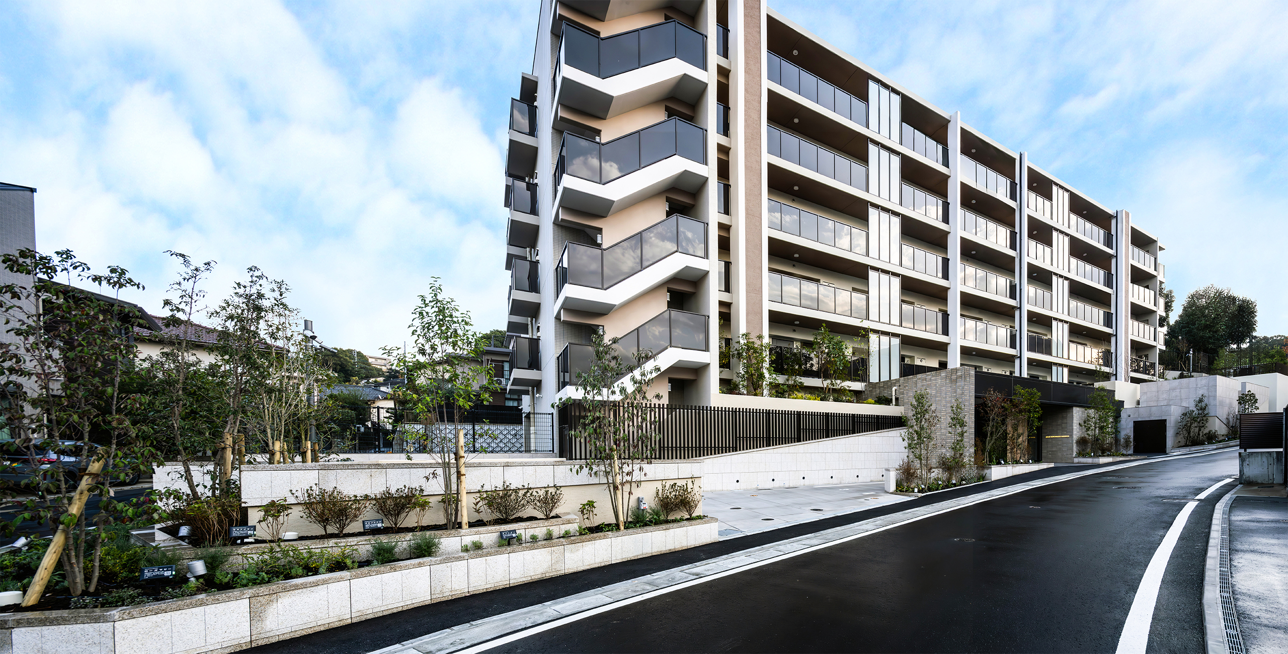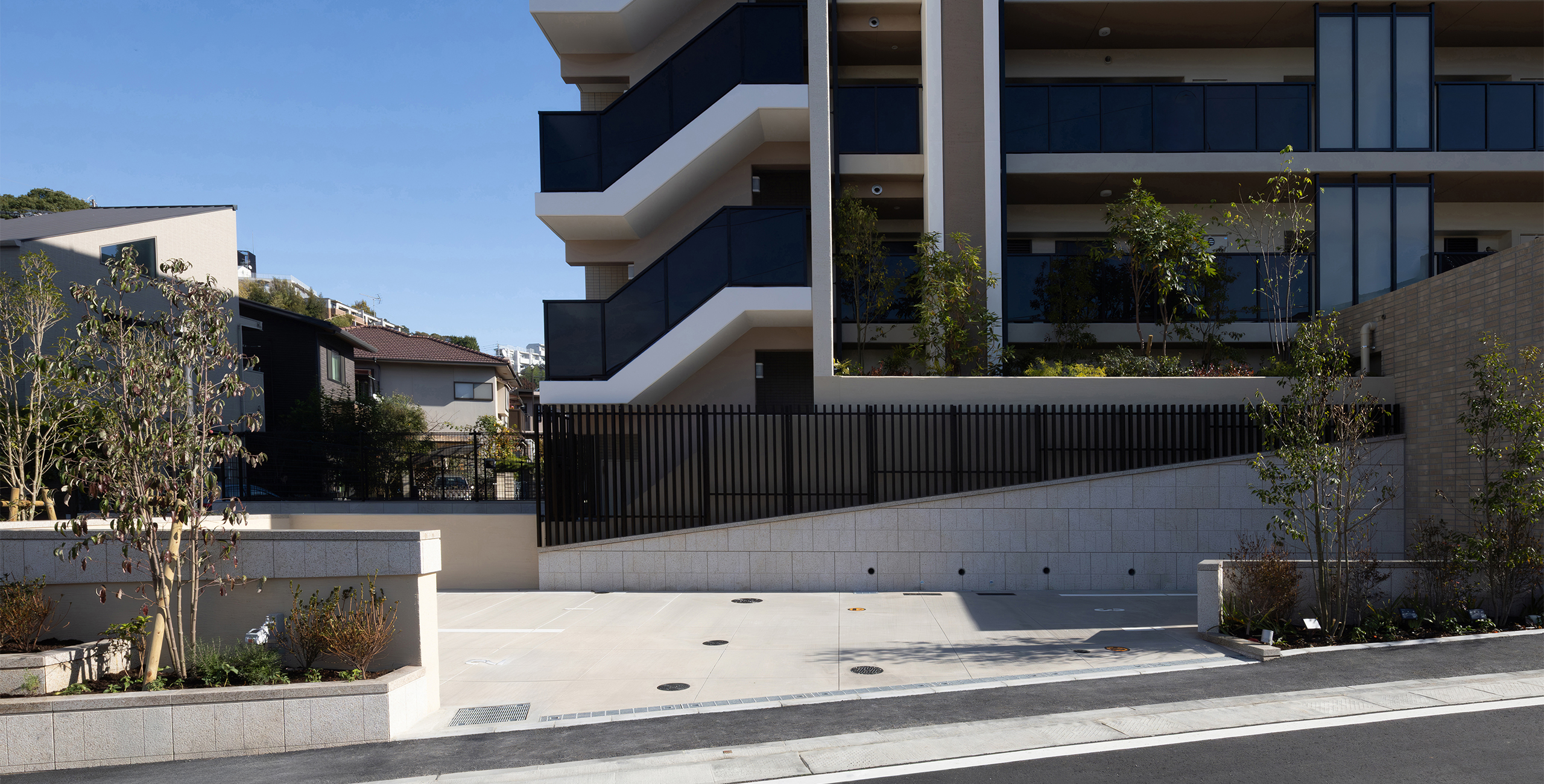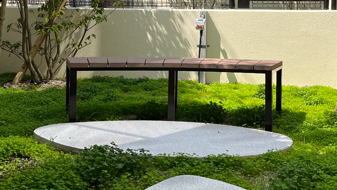 The landscape area connected to the lounge creates a seamless indoor-outdoor composition, giving the space a sense of depth and expansiveness. This effect is thoroughly achieved by extending the line of the curved glass wall, which separates the lounge from the passageway, outward to the exterior. Despite its proximity to the city center, the landscape design takes advantage of the abundant natural surroundings on the site. Centered on the themes of “a home surrounded and protected by greenery” and “a garden where the changing seasons and landscapes overlap,” the design incorporates thoughtful details to allow residents to experience nature’s charm up close.