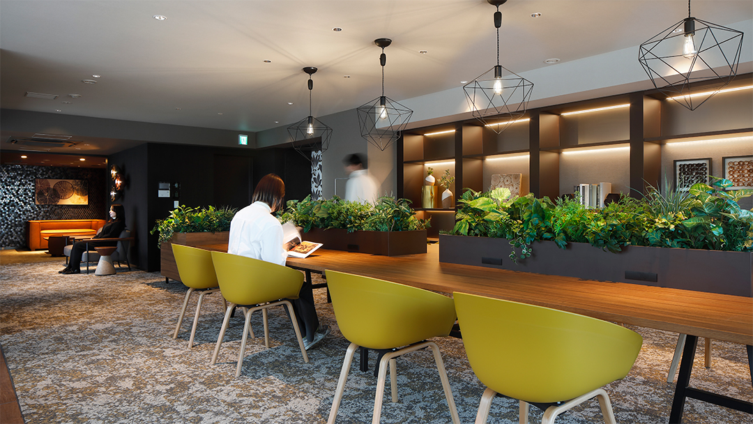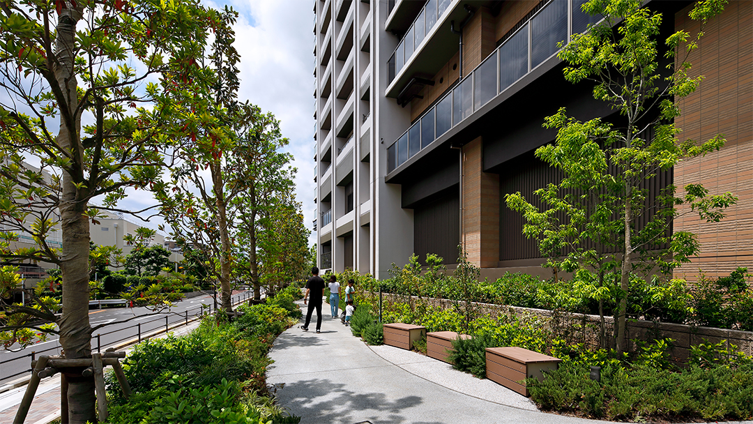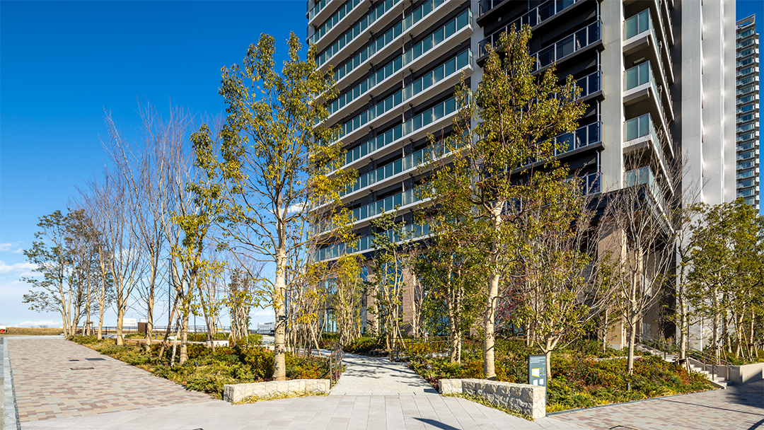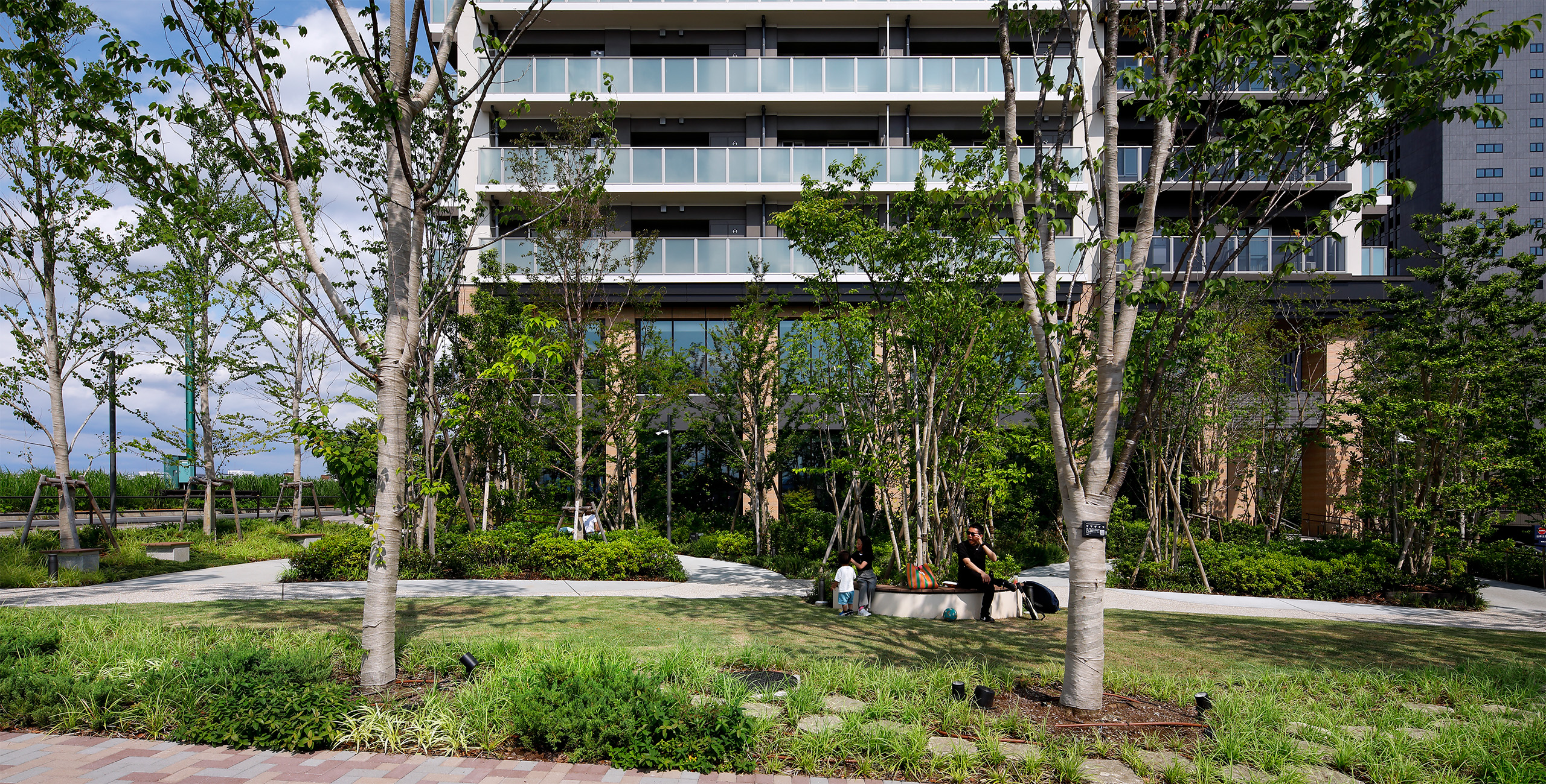 先行街区の開放的なランドスケープデザインに対して、本街区では緑に囲まれながらリラックス出来る憩いの場を設け、対比的な特徴あるランドスケープデザインとした。まち全体を回遊すると、本街区の樹木密度の高さや緑との近さを特徴的に感じることが出来る。また、まち全体で舗装材を揃え、共通の樹種を用いることでまち全体としての一体感を創出することも大切にした。