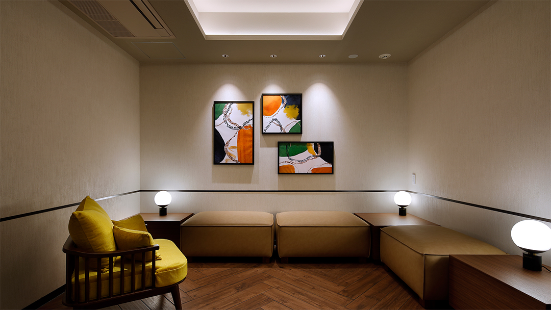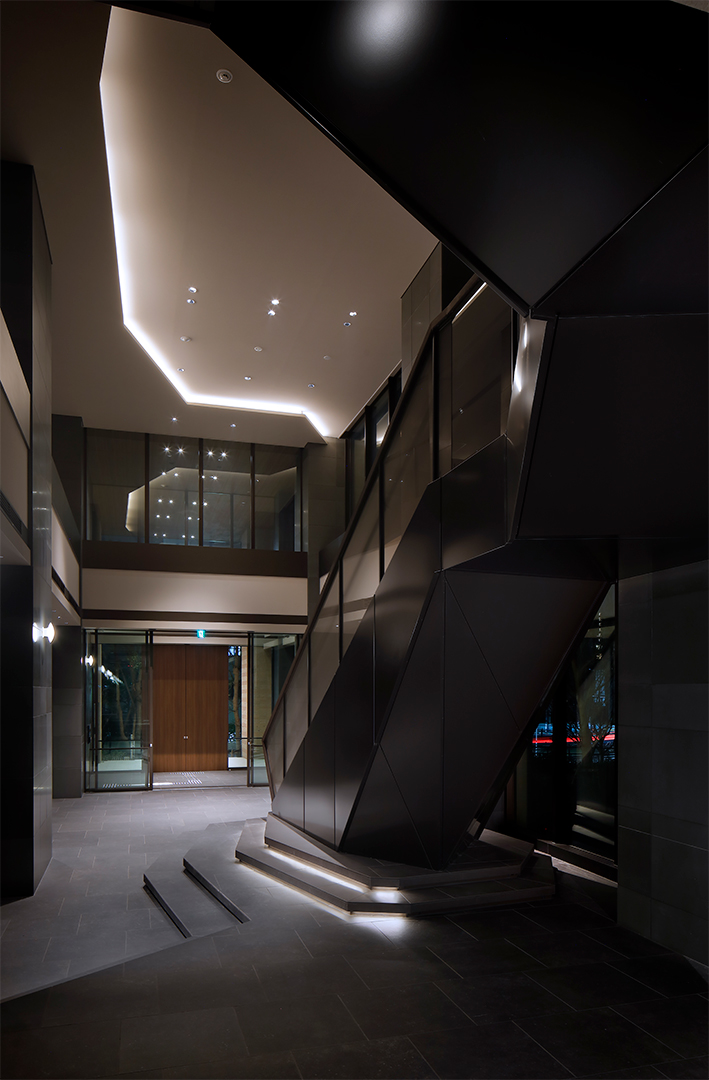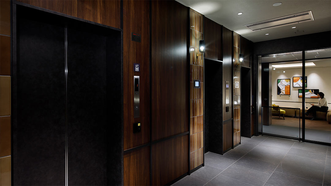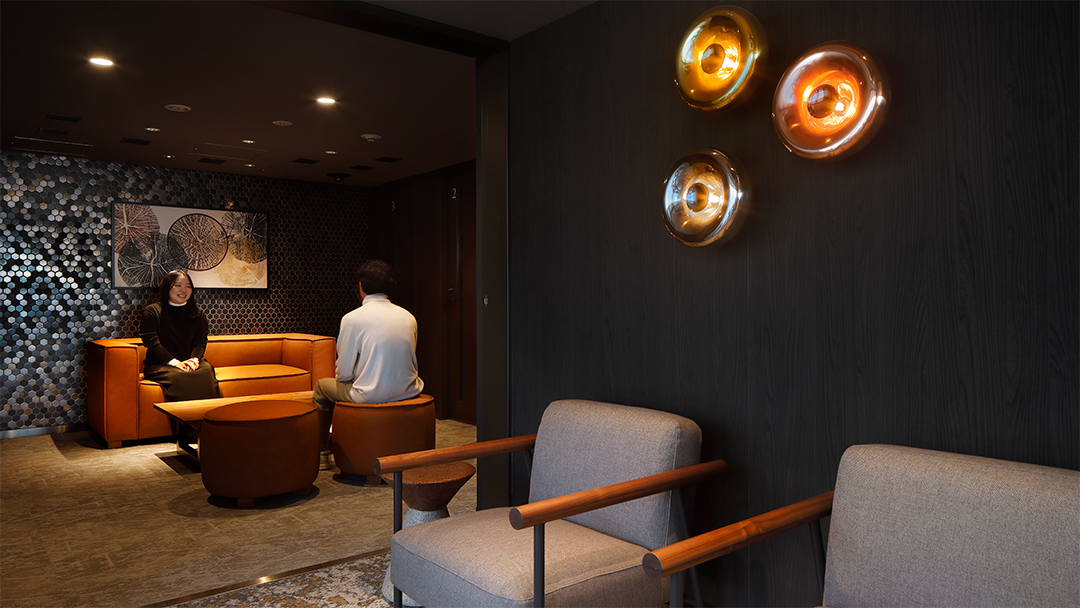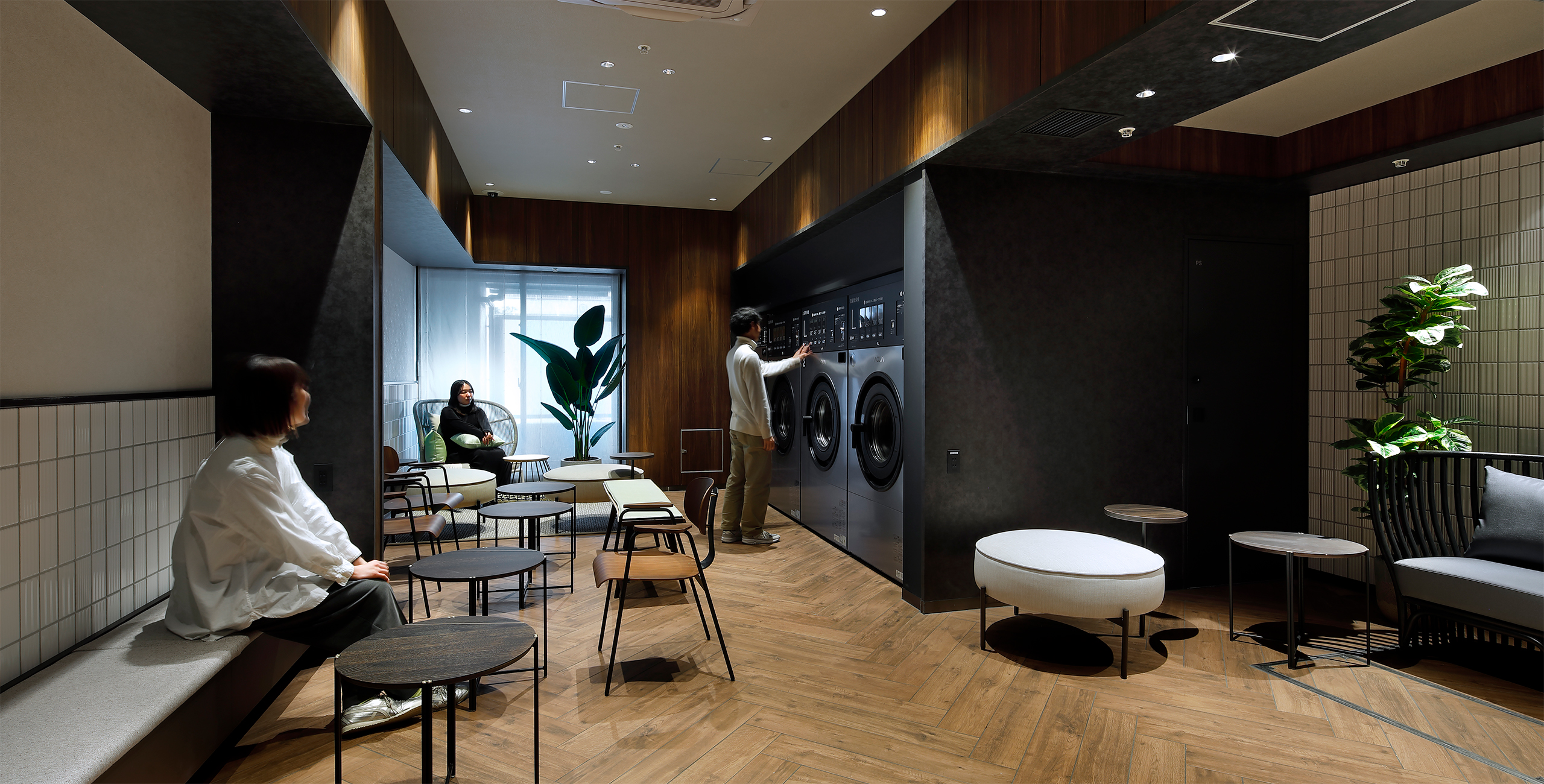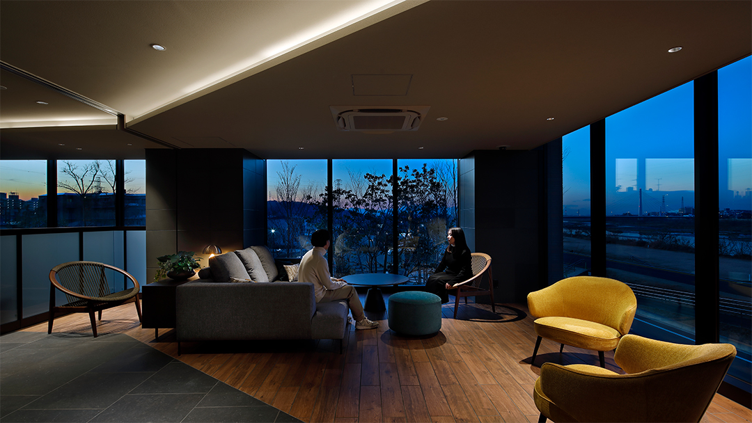 共用部のインテリアデザインは、川岸の森に佇むテラスをイメージし、どこに居ても自然との一体感のある落ち着いた気持ちで過ごせる空間を目指した。エントランスホールは目の前の森が映えるよう濃い色調で構成し、葉脈をイメージしたデザインウォールやランドスケープを眺めながら昇り降り出来る特徴的な階段で、居住者や来訪者を出迎える。2Fのラウンジは、森、川、空を感じることのできるこの地ならではの特別な空間である。美しい夕日を愛でることの出来る特等席であり、刻々と変わる陽光を浴びる森や水面と共に時間や季節の移ろいを楽しむ場所とした。ワーキングラウンジ、ランドリールームでは機能を満たすだけではなく利用者それぞれに寄り添う多様な居場所空間を設け、一日が豊かに彩られるようデザインした。また多摩産の木材を用いたアートなど細部に至るまでここにある自然と共にあることをデザインに昇華している。
