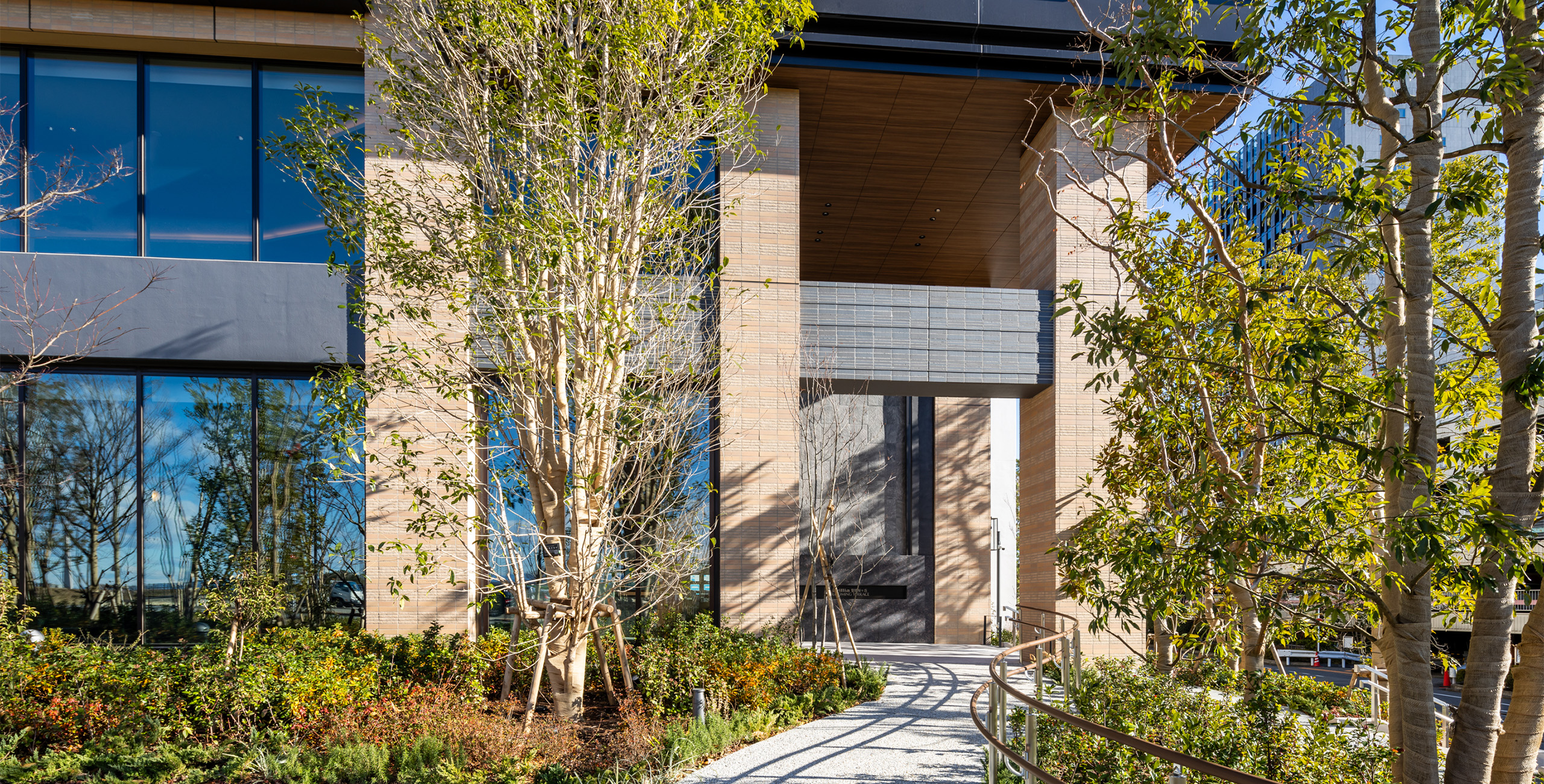 本街区内外が自然や緑量豊かな環境であることから、ファサードデザインコンセプトは大樹が寄り合うことを意味する”BUNDLE”とした。柱と梁がフレーム状に組まれたアウトフレームの重厚感あるボリュームと、持ち出しスラブによるバルコニーの軽やかなガラス手摺のボリュームの組合せによって、異なるボリュームが寄り合って1つのデザインとなるファサードとしている。頂部の矩形クラウンによって大樹としてのボリュームの寄り合わせがスカイラインにも際立つようにした。低層部には自然素材のベージュ系タイルや木目調の金属パネルなどを用いてランドスケープの自然要素と馴染むデザインとなっている。
