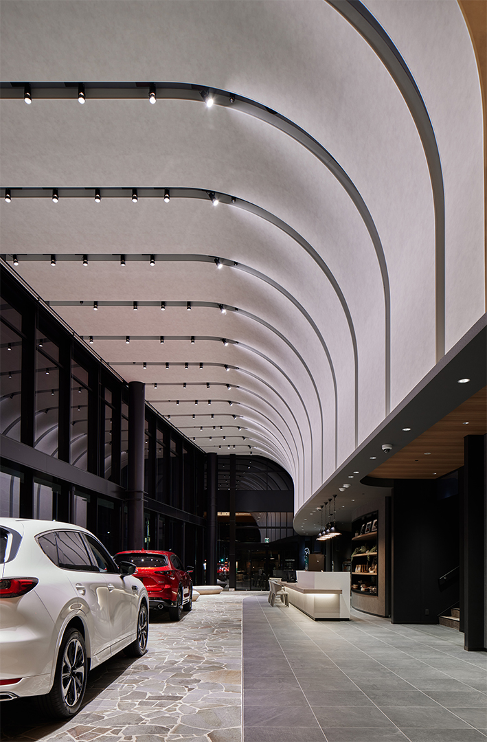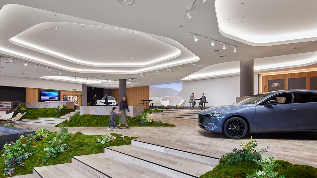 本プロジェクトではショールームという機能を越え、”クルマ”を選ぶ時間も「ドライブの延長上」と捉え、マツダが彩る「旅の思い出」となる時間や空間を体感できる様々な場を設けることを目指した。お客様を出迎える二層吹き抜けの高さを生かしたダイナミックな空間は、流体力学で使用される形状をモチーフとし、車が走り抜ける疾走感やトンネルを抜ける際の高揚感をデザインしている。空間を彩るシンボリックな螺旋階段を上がった先の自然を感じる広場空間には、”クルマ”との多様なシーンを演出したエリアを点在させお客様の多様なライフスタイルを展開した。日常使いのCafeやLivingスペース、イベント時のPartyスペースやDJブースまで備えたショールームが、お客様一人一人の”クルマ”と共にする多様なライフスタイルの楽しみを体感できる空間となることを願っている。