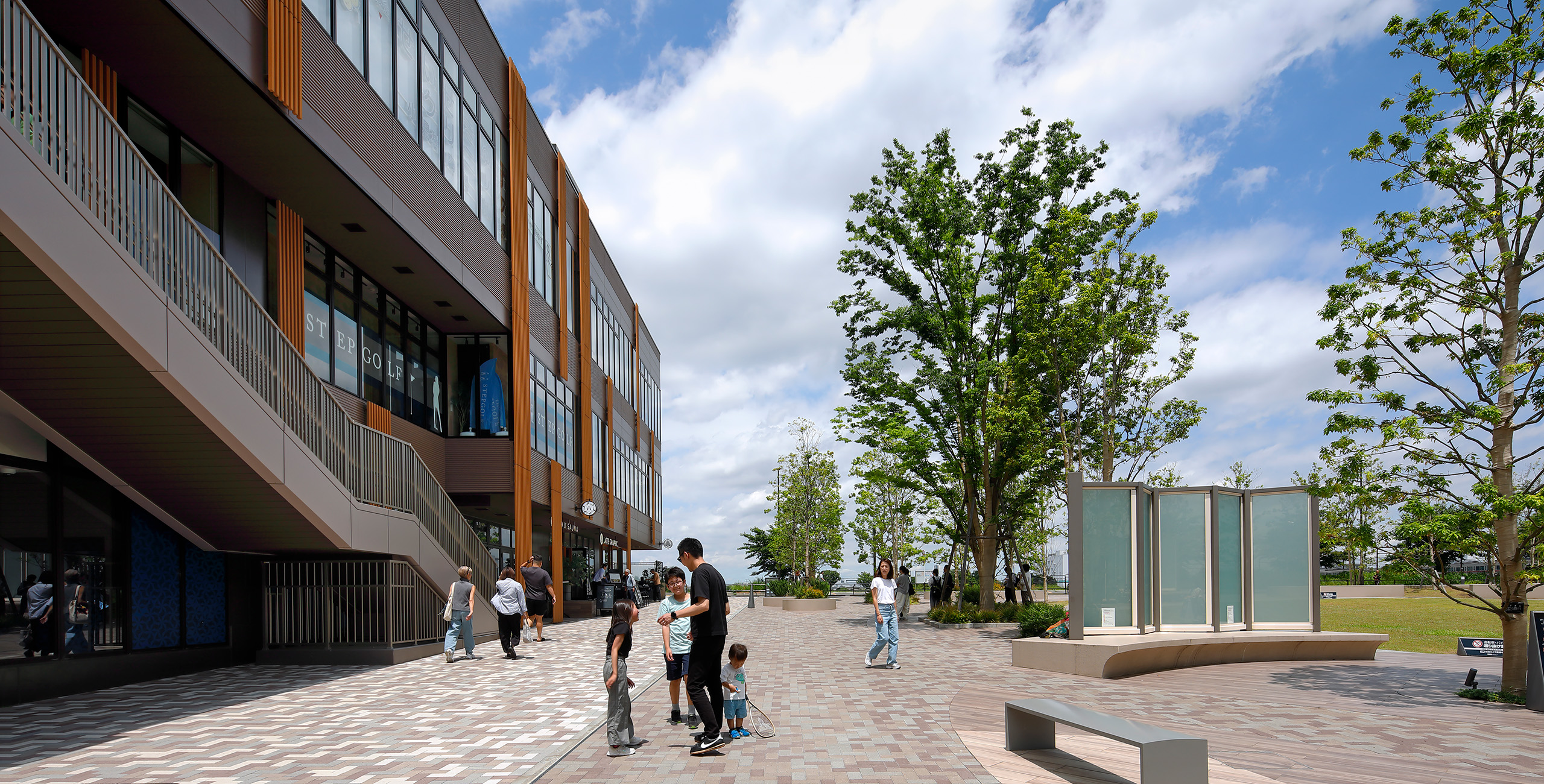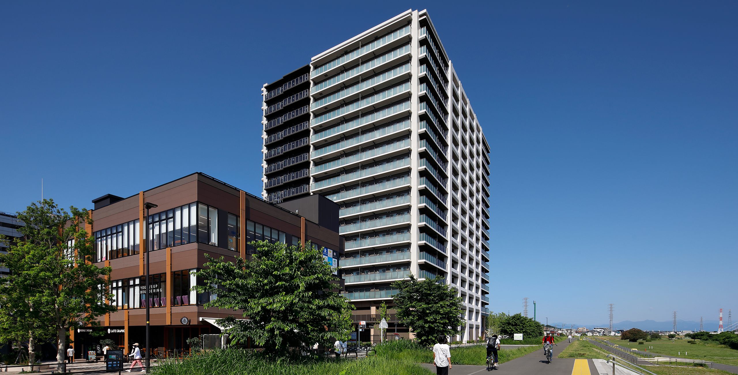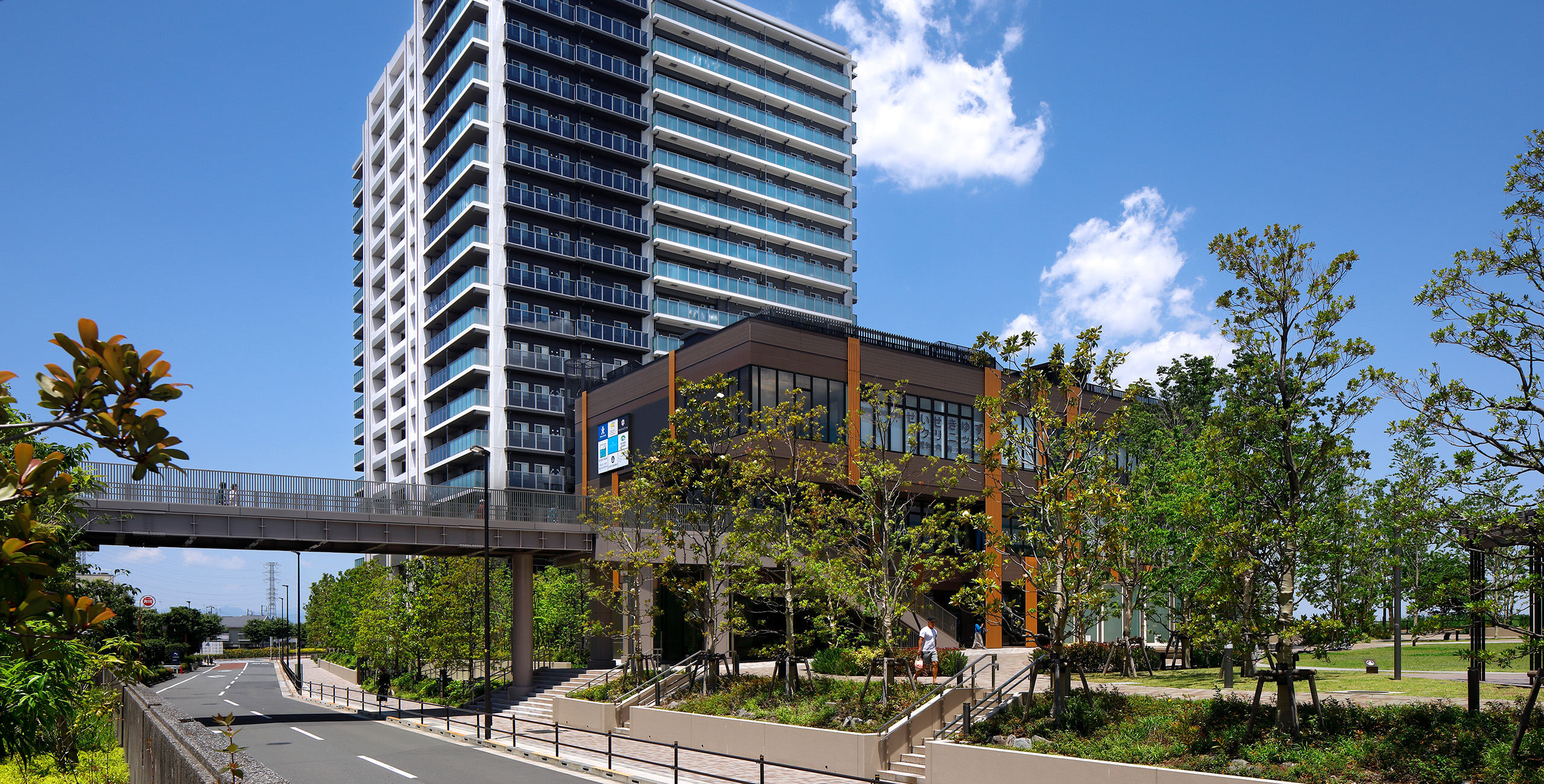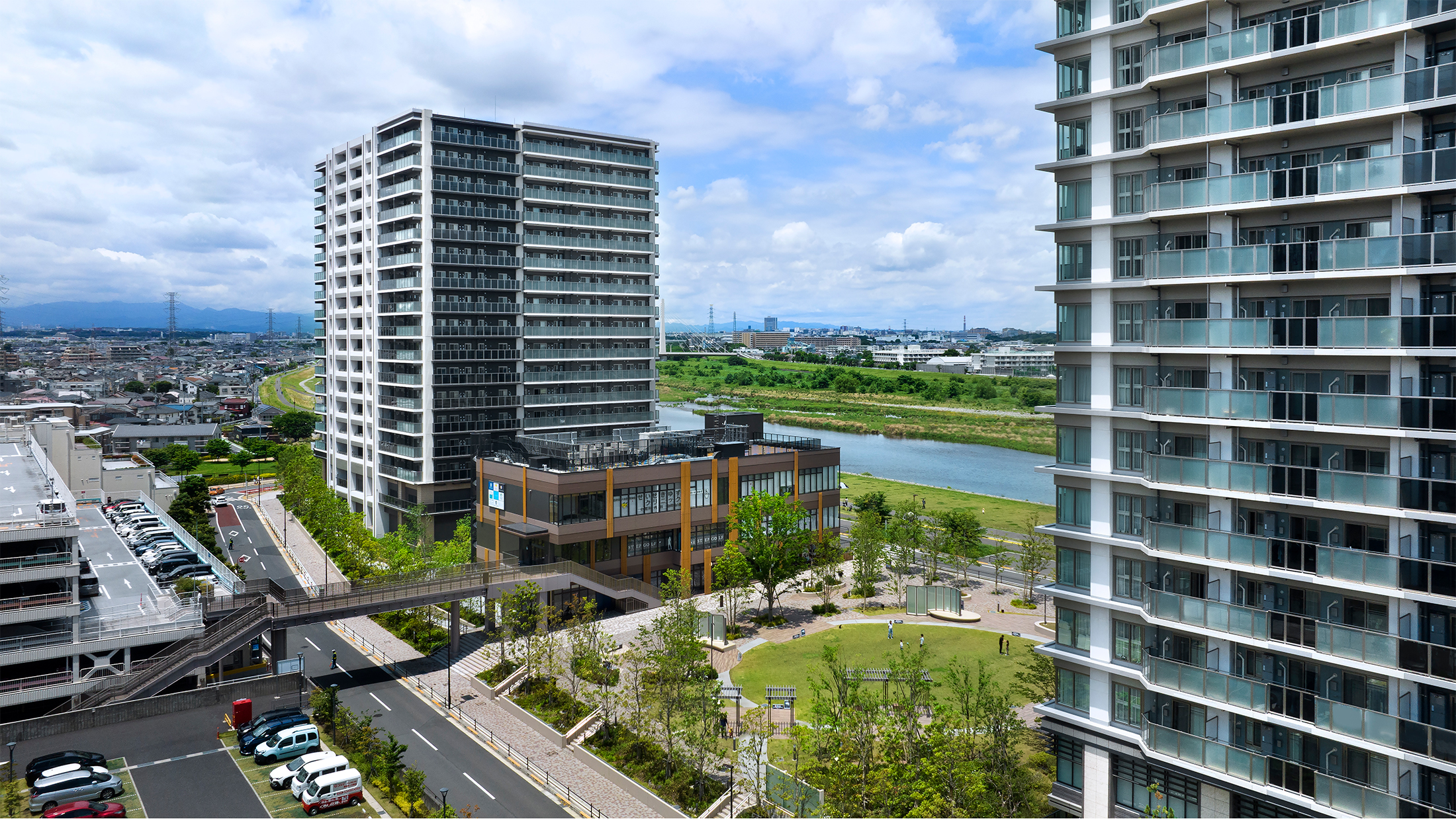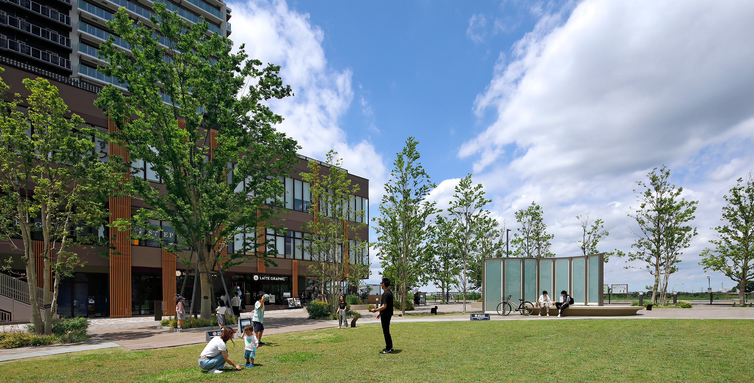 隣接する先行街区の開放的な芝生広場との連続性を高めるため、芝生広場に沿って歩行空間を整備し、一体的な広いランドスケープ空間を創出した。外構仕上げも先行街区のデザインを引き継ぎ、多摩川への方向性を感じさせる舗装パターンを用いる、一体開発としてのまとまり感をランドスケープデザインでは大切にしている。